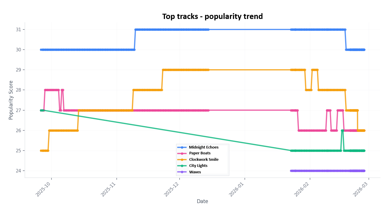 Get instant alerts when a track's popularity rises or drops, plus a weekly summary packed with easy-to-read graphs showing listener and popularity trends over time. And we don't just report numbers — every email includes practical suggestions on which song to promote and how to focus your marketing and social media for maximum impact.